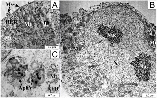 Electronograms of LNCaP cells: (A) from the control group and (B,C) treated with CAPE. AphV—autophagosomes, L—lysosome, Mt—mitochondria, Mv—microvilli, N—cell nucleus, Nuc—nucleoli, RER—rough endoplasmic reticulum.