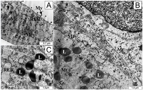 Ultrastructure of LNCaP cells: (A) from the control group and (B,C) treated with curcumin. L—lysosomes, Mt—mitochondria, Mv—microvilli, RER—rough endoplasmic reticulum, V—vacuoles.
