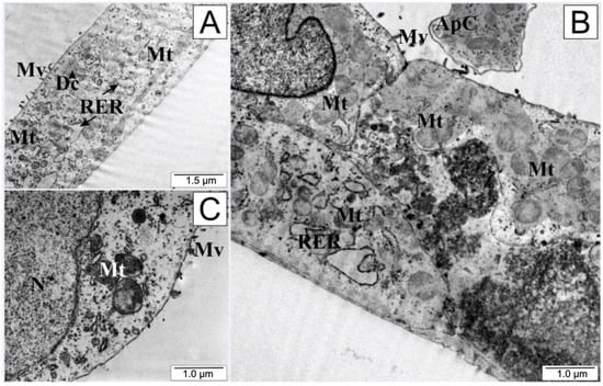 Electronograms of LNCaP cells: (A) from the control group and (B,C) treated with quercetin. ApC—apoptotic body, Dc—dictiosome, Mt—mitochondria, Mv—microvilli, N—cell nucleus, RER—rough endoplasmic reticulum.