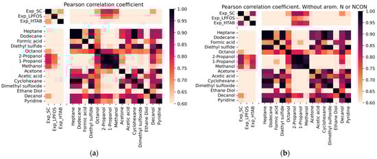 Heatmap of pairwise correlation of logP values for experimental and B3LYP calculated predictions. Three first logP values are the experimental values in SC, LPFOS and HTAB micelles, respectively. The heat map is colored by the significance of Pearson coefficient, where a darker red indicates a higher degree of correlation. In (a) all compounds are used, in (b) molecules with Nitrogen in an aromatic ring or with the urea (carbamide) group are excluded.