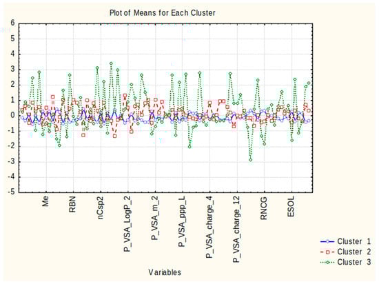 Cluster 1 contains 45 out of all 63 compounds (approximately 70% of the cases). The members do not differ substantially with respect to their structural and molecular descriptors, whose values are on a medium level (see Figure 2) without an expressed minima or maxima of their absolute (standardized) values. It may be assumed that this pattern of objects is a specific “medium” with respect to the descriptor values, is characterized by a good consistency of indication, and could be called, conditionally, a “mixed compound” pattern.