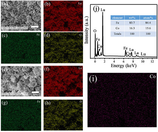 Figure 3 presents the surface SEM images, corresponding individual elemental mapping, and EDS spectra results. Figure 2a,e shows the morphologies of LFO and LC15, respectively. It can be seen that the two samples mainly consist of sphere- or polyhedral-shaped particles, and the average particle sizes of the two samples are 1.8 μm and 2.3 μm, respectively. Obviously, Co doping could lead to the growth of the LuFeO3 particles, since a lower reaction temperature and a shorter time of calcination are needed to obtain single-phase Co-doped LuFeO3, according to the XRD results, which are in accordance with the results reported by Somvanshi et al. [27]. The individual elemental distributions of LFO and LC15 are displayed in Figure 3b–d and Figure 3f–i, respectively. It shows that all constituent elements are distributed uniformly. The EDS spectrum of sample LC15 shown in Figure 3j manifests that Lu, Fe, Co, and O elements are obviously contained in the sample, and no other impurities were found. As can be seen from the table in the upper right corner of Figure 3j, the contents of the Fe and Co elements are in line with the nominal ratio.