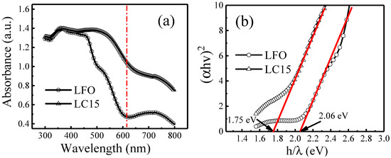 (a) UV–vis absorption spectra of samples LFO and LC15, and (b) corresponding Tauc plot.