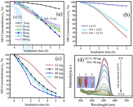 (a) Effects of sample LC15 dosage on the photocatalytic degradation of MO with an OA dosage of 12 mg; (b) comparison of the photocatalytic capacities of sample LC15 (50 mg) and LFO (50 mg); (c) effects of OA dosage on the photocatalytic degradation of MO with an LC15 dosage of 50 mg; (d) evolution of the absorbance spectra of MO of the best results with sample LC15 and OA dosages of 50 mg and 40 mg, respectively. The three centrifugal tubes marked by 1, 2, and 3 denote the MO solution, the MO and OA mixed solution, and the degraded solution after 5.5 h of irradiation.