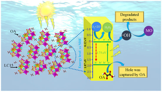 Schematic of the possible mechanism for the photoexcited electron–hole separation and transport processes at the LC15 sample interface, assisted by OA under visible light irradiation.