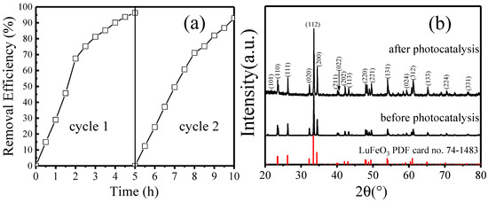 To reduce the cost of photocatalysis, reusability and stability are two essential features of a photocatalyst. Using the same protocol, the degradation of MO was carried out again by reusing the sample LC15 collected after the first photocatalysis experiment. The comparison of removal efficiency between cycles 1 and 2 is shown in Figure 7a. It is clear that the reduction in removal efficiency is negligible, which suggests that the reusability is good. Figure 7b shows the XRD patterns before and after photocatalysis. Obviously, the orthorhombic structure of sample LC15 is maintained, as all the diffraction peaks corresponding to each plane of orthorhombic LuFeO3 are unchanged and no other diffraction peaks appear. These results indicate the good reusability and stability of sample LC15.