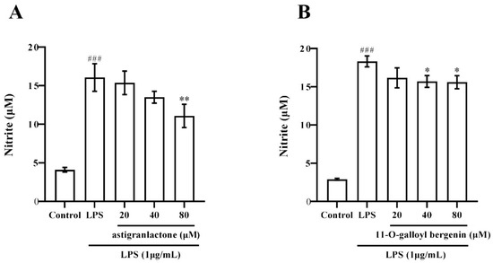 2.3. Effect of the Astigranlactone and 11-O-Galloyl Bergenin on NO Secretion in the Supernatant of RAW264.7 Cells Induced by LPS