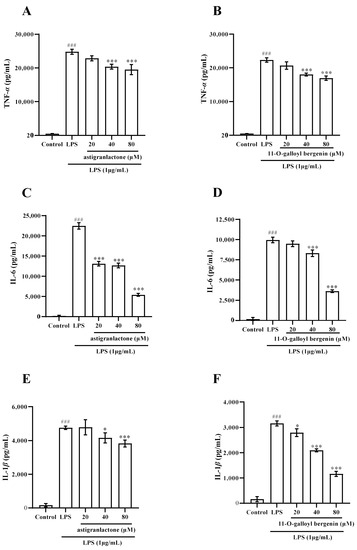 2.4. Effect of the Astigranlactone and 11-O-Galloyl Bergenin on the Content of TNF-α, IL-6 and IL-1β in the Supernatant of RAW264.7 Cells Induced by LPS