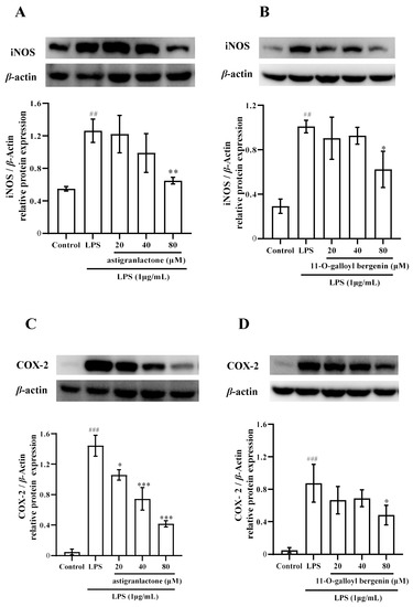 2.5. Effect of the Astigranlactone and 11-O-Galloyl Bergenin on COX-2 and iNOS Expression in LPS-Induced RAW264.7 Cells