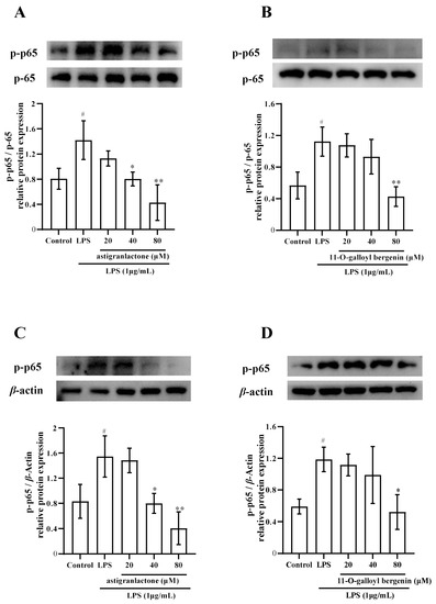 2.6. Effects of Astigranlactone and 11-O-Galloyl Bergenin on the NF-κB Inflammatory Signaling Pathway in LPS-Induced RAW264.7 Cells