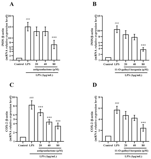2.7. Effect of Astigranlactone and 11-O-Galloyl Bergenin on iNOS and COX-2 mRNA Expression in LPS-Induced RAW264.7 Cells