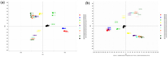 PCA plot of the metabolic profiles of fecal samples incubated with SECO in (a) the +ESI mode and (b) −ESI mode. A: micro-aerobic conditions; N: anaerobic conditions.