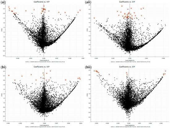 PLS-DA VIP vs. coefficient plot of the metabolic profiles of fecal samples incubated with SECO in the (a) +ESI mode and (b) −ESI mode. (i): Micro-aerobic conditions; (ii): anaerobic conditions.