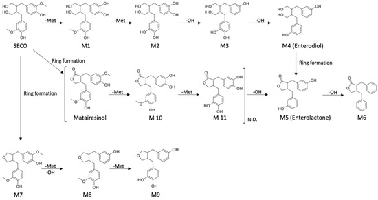 The bioavailability of dietary lignans is very limited, as they are seldom absorbed in the small intestine or excreted in urine [21,22,23]. However, a large fraction of them reach the colon and are metabolized by intestinal bacteria in a series of steps of hydrolysis, dehydroxylation, demethylation, and oxidation to form “mammalian” lignans, enterodiol, and enterolactone, which were first detected in the urine of humans and female rats fed with flaxseed [24,25]. Unlike natural lignans present in plants, these “mammalian” lignans carry phenolic hydroxy groups only in the meta position of the aromatic rings [26]. Numerous studies have indicated that the estrogen–receptor binding affinity and bioactivities of the “mammalian” lignans are more potent than those of plant lignans, thus emphasizing the role of gut microbiota in biotransformation [27,28,29].