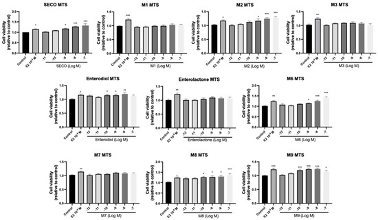 Effects of SECO and identified metabolites on cell viability of MC3T3-E1 cells. Cells were treated with vehicle, E2 (10−8 M), and different compounds (10−12−10−7 M) in phenol red-free medium for 24 h. Cell viability was measured via MTS assay. Data are shown as mean ± SEM and analyzed using one-way ANOVA, followed by Tukey’s multiple comparison test. * p < 0.05, ** p < 0.01, *** p < 0.001 vs. control (n = 6).