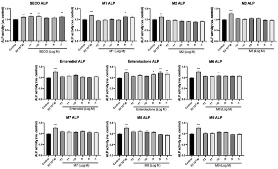 ALP is produced by osteoblasts and plays important roles in osteoid formation and mineralization, therefore acting as a marker for bone formation [38]. In order to understand the osteogenic effects of microbial transformation products, osteoblastic cell viability and ALP activity were examined in pre-osteoblast MC3T3-E1 cells. E2 (10−8 M) was selected as a positive control due to its recognized anabolic effects on bone cells through estrogen-dependent pathways [39]. As shown in Figure 6 and Figure 7, SECO significantly increased the cell viability of MC3T3-E1 cells at 10−9 to 10−7 M (p < 0.05 vs. control) and cell differentiation at 10−11, 10−10, and 10−7 M (p < 0.01 vs. control). For the metabolites, M2, enterodiol, M8, and M9 dose-dependently improved cell viability with lowest concentrations of 10−9 (p < 0.05 vs. control), 10−10 (p < 0.05 vs. control), 10−10 (p < 0.05 vs. control), and 10−10 M (p < 0.001 vs. control), respectively. However, they did not show significant effects on ALP activity. In contrast, M1 at 10−8 M (p < 0.05 vs. control) and enterolactone at 10−9 M (p < 0.05 vs. control) only markedly elevated ALP activity. M6, which removed all the phenolic hydroxy groups after a series of dehydroxylation, showed significant effects on both cell viability (p < 0.05 vs. control) and osteogenic cell differentiation (p < 0.05 vs. control).