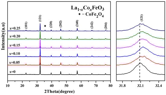 XRD diffraction and (121) peak drift patterns of La1−xCoxFeO3 (x = 0~0.25) samples calcined at 700 °C for 6 h.