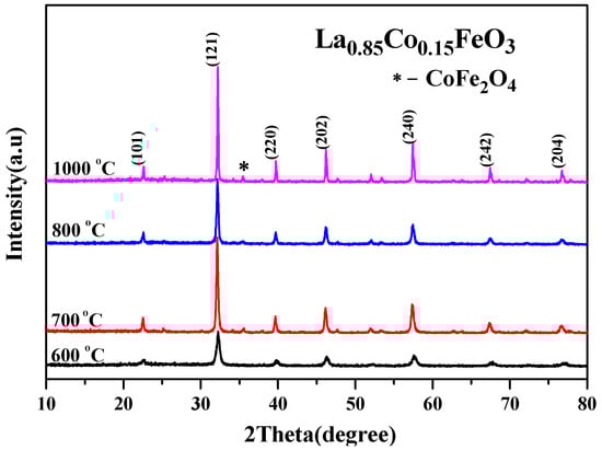 XRD diffraction pattern of La0.85Co0.15FeO3 calcined at 600~1000 °C for 2 h.