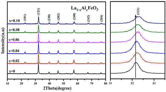 Figure 4 is the XRD pattern of the La1−xAlxFeO3 (x = 0~0.10) sample. This may be due to the fact that the Al3+ ionic radius (0.0535 nm) is similar to the B-site Fe3+ ionic radius (0.078 nm), resulting in the formation of the Fe2O3 impurity phase. Table 1 shows that the lattice parameters (a, b, c), crystal cell volume and particle size showed a trend of being smaller with the increase in Al3+ doping concentration because La3+ ion radiuses (0.274 nm) are replaced by a smaller Al3+ ion radiuses [25].