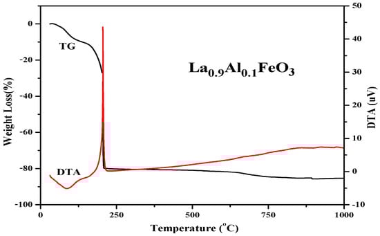 Figure 6 is the TG and DTA curves of La0.9Al0.1FeO3 xerogel. When the temperature rose from 30 °C to 140 °C, the TG curve showed that the weight loss rate was about 10%. Then, at 90 °C, the DTA curve shows a weak endothermic peak due to water evaporation from the wet gel and the expulsion of water inside the dry gel (adsorbed water, crystallization water, and water vapor generated during the reaction). When the temperature increases from 140 °C to 207 °C, there is a weight loss of about 70 percent and a sharp exothermic peak corresponding to the DTA curves at about 207 °C. When the temperature is higher than 207 °C, the weight loss rate was less than 5%, forming La1−xAlxFeO3 [7].