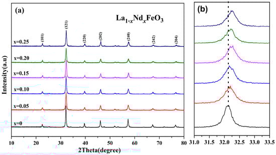 (a) XRD of La1−xNdxFeO3 (x = 0~0.25) samples calcined at 600 °C and (b) (121) peak drift.