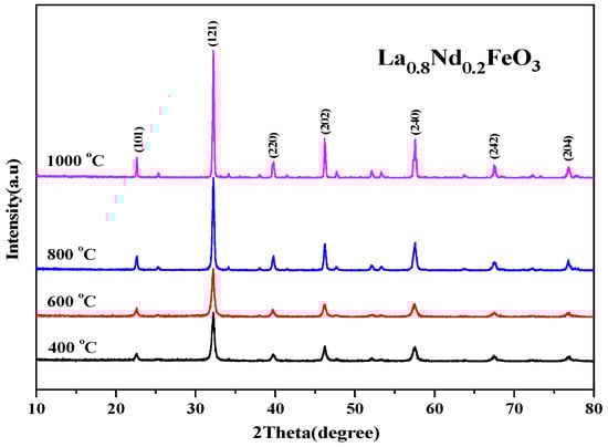 XRD diffraction pattern of La0.8Nd0.2FeO3 samples calcined at between 400 and 1000 °C for 2 h.