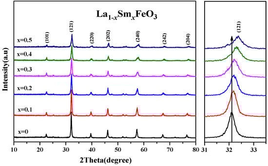 Figure 9 shows an XRD diffraction pattern of the La1−xSmxFeO3 (x = 0~0.5) samples. According to the tolerance factor t = rA + rO/1.414 (rB + rO), rA, rB, and rO are A-bit ionic radius, B-bit ionic radius, and O ionic radius, respectively. For part of the A-bit doped samples, rA = (A′ ionic radius) (1 − x) + (radius of doped ions) x; when t values were between 0.75 and 1.00, the perovskite structure was stable. According to the ionic radius records [31,32], La3+ ionic radius was 0.274 nm, Sm3+ ionic radius was 0.124 nm, Fe3+ ionic radius was 0.0645 nm, O ionic radius was 0.132 nm, and the t value of the series samples was between 0.75 and 1.00, which had a stable perovskite structure [33,34]. As the Sm3+ doping concentration increased, the intensity of diffraction peaks decreased. The drift pattern shows that as the Sm3+ doping content increased, the diffraction peak drifted in the direction of the larger angle. This explains that according to the equation below, the smaller radius of Sm3+ (ionic radius of 0.124 nm) replaced the larger radius of La3+ (ionic radius of 0.274 nm).
