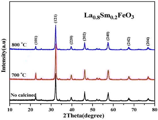 Table 4 shows that as the Sm3+ ion doping amount increased, the cell volume decreased. Figure 10 shows the XRD diffraction pattern of uncalcined La0.8Sm0.2FeO3 samples, and then calcined at 700 °C and 800 °C for 2 h. The sample diffraction peaks were sharp, suggesting that the samples crystallized well after sintering at a certain temperature. The half-width of the diffraction peak of the samples was 0.371, 0.333, and 0.378, respectively, corresponding to the aforementioned calcination temperatures, with a first decreasing then increasing change trend [1,2]. The average grain size of the samples was 22.7, 25.9, and 21.1 nm, respectively, corresponding to the aforementioned calcination temperatures, with a first increasing then decreasing change trend [6,7].