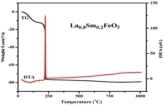 Figure 11 shows the TG and DTA curves of La0.8Sm0.2FeO3 xerogel. When the temperature rose from 30 °C to 200 °C, the TG curve showed that the weight loss rate was about 13%. Then, the DTA curve showed a weak endothermic peak at 98.5 °C due to the water evaporation from the wet gel. The weak endothermic peaks at 133 °C and 171 °C were due to the expulsion of water from inside the dry gel. When the temperature rose from 200 °C to 226 °C, the weight loss was about 63%, showing a sharp exothermic peak corresponding to the DTA curves at about 226 °C, which may be due to emissions of nitrates and organic substances, including NOx, COx, and H2O. When the temperature was higher than 226 °C, the weight loss rate was less than 3%, indicating the formation of La1−xSmxFeO3.