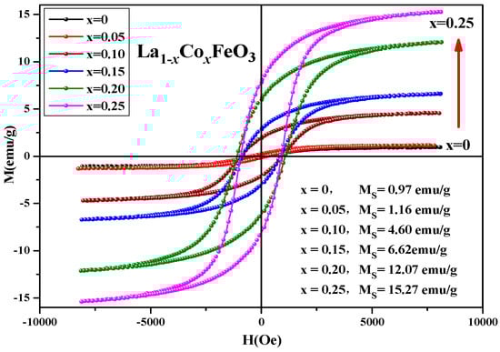 Figure 12 shows the hysteresis loop of the La1−xCoxFeO3 (x = 0~0.25) sample. When the applied magnetic field is 8000 Oe, the magnetization reaches a saturation state [35]. As shown in Table 5, with the increase in Co2+ concentration, the magnetic loop area and magnetization increased. The change of valence state of the A-site ions will directly affect the state of the oxygen ions, which will eventually lead to the generation of oxygen vacancies.