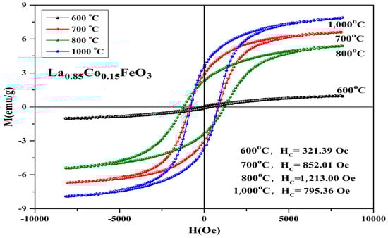 Figure 13 shows the hysteresis loop of La0.85Co0.15FeO3 sample calcined at temperatures between 600 and 1000 °C for 6 h. When the applied magnetic field is 8000 Oe, the magnetization reaches a saturation state. Figure 13 and Table 6 show that when the samples calcined temperature rose from 600 °C to 700 °C, the loop area of the M-H curve changed significantly. With the increase in calcination temperature, the saturation magnetization, remanent magnetization, and coercivity of the samples increased, which may be affected by the mixed-phase CoFe2O4 samples.