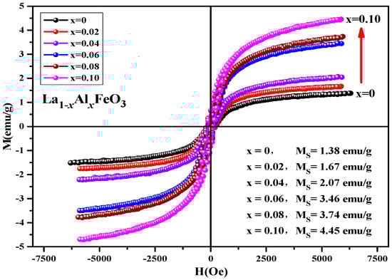 Hysteresis loop of La1−xAlxFeO3 samples calcined at 600 °C for 2 h.