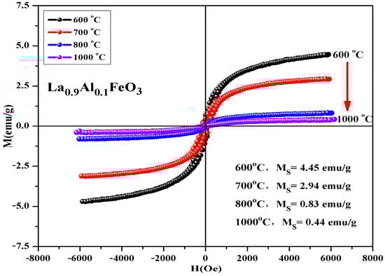Figure 15 is hysteresis loop of La1−xAlxFeO3 (x = 0~0.10) samples, the magnetic loop area and magnetization increased with the increase in Al3+ ion concentration and the weak ferromagnetic properties are shown in Table 8. In fact, in the perovskite structure, Fe3+ was in a distorted octahedral B-site location, and the octahedron distortion was inclined along the c-axis direction, and the inclination depended on the size of the adjacent A-site ions, which ultimately determined the Fe-O-Fe super-exchange angle. The reason this may enhance the magnetic properties is as follows: First, when Al3+ ions substituted La3+ ions, the effective size of the A-site of octahedral reduced, changing the Fe-O-Fe super-exchange angle and promoting super-exchange interaction. Second, when the sample was doped, only a small fraction of La3+ was substituted by Al3+ ions, which tend to occupy Fe3+ ion positions at octahedral B-bit. When Al3+ ion substituted the Fe3+ ion, Fe3+ was squeezed into the La3+ ion position of the regular tetrahedron A-bit. This time, the Fe3+ ion spin was not compensated, and the magnetic properties of the sample can be improved. In addition, Fe2O3 impurity phase was detected by XRD, which may also enhance the magnetic properties of the La1−xAlxFeO3 samples [21,22]. Figure 16 shows the hysteresis loop of La0.9Al0.1FeO3 samples. It can be seen from the figure that as the calcination temperature increased, the M-H curve of the sample enclosed area reduced, the ferromagnetic order gradually weakened and tended to be of the antiferromagnetic order, which may be due to with the increase in sintering temperature, decrease in iron oxide composition, and changes in the magnetic properties [14].