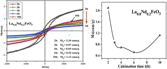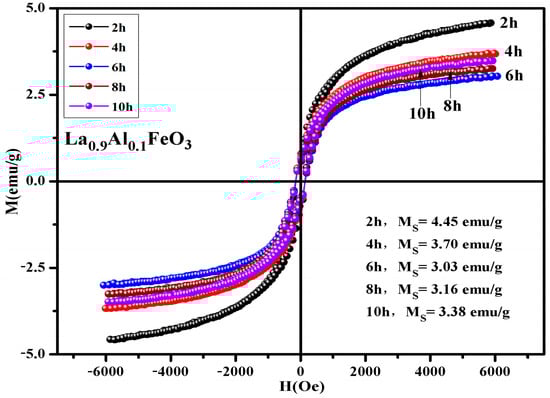 Table 9 shows that the calcination temperature has the same effect on Ms, Mr, and Hc; all of which showed a declining trend as T increased. Figure 17 shows the hysteresis loop of La0.9Al0.1FeO3 samples. The calcination time can regulate the magnetic properties of the sample, as shown in Table 10. From 2 h to 6 h, the magnetic properties reduced significantly. When the calcination time increased from 6 h to 10 h, the sintering time showed little impact on the changes in the magnetic properties.