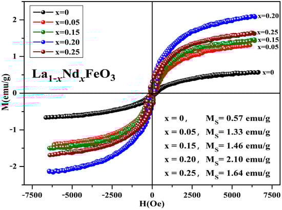 Hysteresis loop of La1−xNdxFeO3 (x = 0~0.25) samples calcined at 600 °C for 2 h.