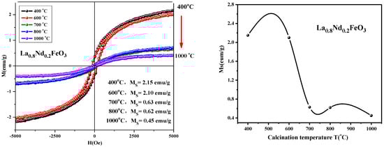 Hysteresis loop and saturation magnetization of La0.8Nd0.2FeO3 samples calcined between 400 and 1000 °C for 2 h.