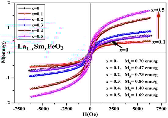 Hysteresis loop of uncalcined La1−xSmxFeO3 (x = 0~0.5) samples.