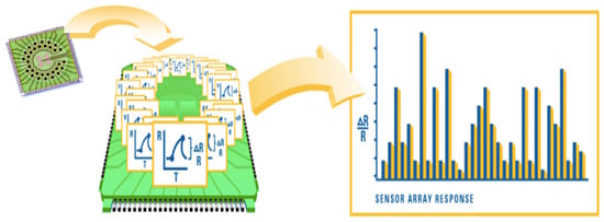 Working principle of Cyranose 320. It is based on a nano-composite array of 32 organic polymer sensors. If exposed to VOC combinations, the polymers swell, thereby modifying their electrical resistance. Raw data are registered as the increase in resistance of any single sensors and the combination of all signals results in a “breathprint”.