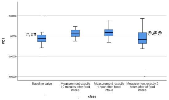 Box plot showing comparisons of PC1 among different times. p < 0.050 for the following: #: Baseline vs. 10 min after food intake; ##: Baseline vs. 1 h after food intake; @ 10 min after food intake vs. 2 h after food intake; @@: 1 h after food intake vs. 2 h after food intake.