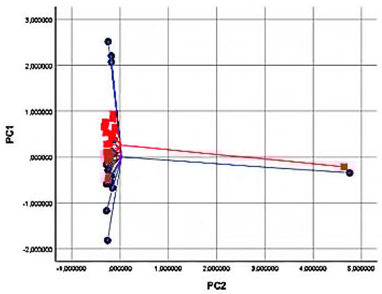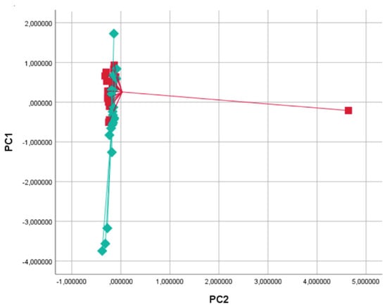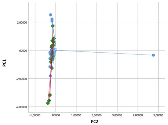 All data analyses were performed using SPSS for Windows 26.0 (SPSS, Chicago, IL, USA). The Kolmogorov–Smirnov demonstrated a non-parametric distribution of data. Categorical values were analyzed using the chi-square test or Fisher’s exact test as appropriate and were reported as n (%). Median (interquartile range [IQR]) was used to express continuous variables with nonparametric distribution. Data were reduced by principal component analysis. All four Principal Components (PCs) were compared at the aforementioned different times (T0, T1, T2 and T3) by Kruskal–Wallis test. Where it showed the significance, individual groups were compared two to two by the Mann–Whitney U test and Shapiro–Wilk tests. Following that, successive linear canonical discriminant analysis (CDA) was carried out to obtain the cross-validated accuracy percentage (CVA%). This percentage serves as an estimate of how effectively a predictive model will perform in real-world scenarios. Furthermore, a receiver operating characteristic curve (ROC-curve) was constructed using predicted probabilities in order to calculate the area under the curve (AUC). To ensure a manageable standard error of 10%, we determined the appropriate sample size for our study. Taking into account an estimated accuracy rate of 80%, the current sample size per subgroup was deemed sufficient. We established a threshold for statistical significance with a p-value of <0.05.