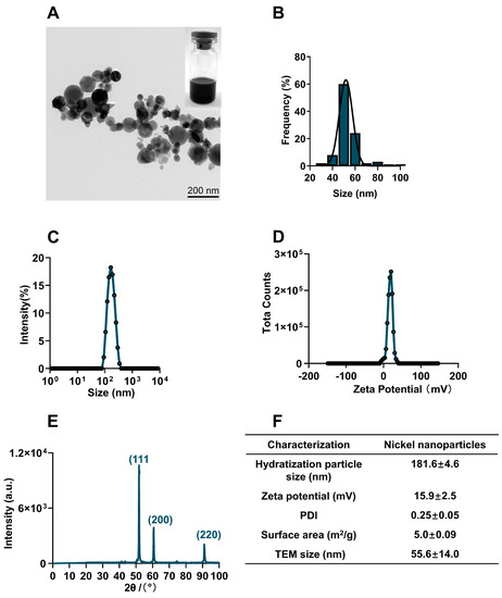 Physicochemical characterization of NiNPs. (A) TEM images showed the morphology of NiNPs. Scale bar, 200 nm. (B) Gaussian distribution of NiNPs diameter. (C,D) Hydrodynamic size distribution and surface charge of NiNPs measured by DLS. (E) X-ray diffraction (XRD) patterns of NiNPs. (F) Specific information on the NiNPs used in this research.