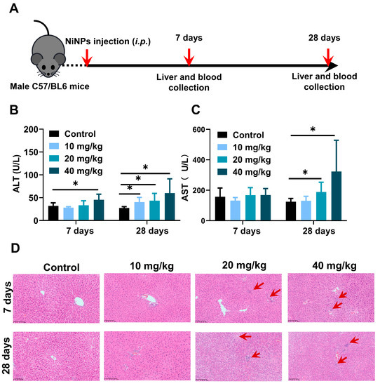 NiNPs exposure increased hepatic damage in mice. (A) Schematic illustration of experimental design. C57/BL6 mice were intraperitoneally injected (i.p) with NiNPs at dosages of 10, 20, 40 mg/kg/day for 7 and 28 days. (B,C) Serum ALT, AST levels of mice. (D) H&E results of the histological changes. Red arrow: macrophage infiltration; scar bar, 100 μm. Each bar represents mean ± SD. (n = 6, * p < 0.05 compared to control group).