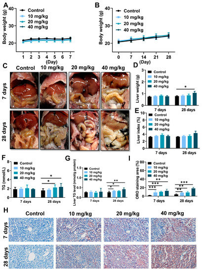 As represented in Figure 3A,B, there were no remarkable differences between NiNPs-treated and control groups in terms of the body weight of the mice. Notably, NiNPs administration leads to various manifestations of lipid accumulation and even steatosis, reflected in the weakened color of the liver (Figure 3C) and increased liver weight (Figure 3D). In addition, triglyceride (TG) levels in serum and liver tissues were elevated (Figure 3F,G), and Oil Red O (ORO) images showed that lipid deposition activated hepatic steatosis (Figure 3H,I). However, the liver index of the NiNPs treatment groups exhibited no significant differences (Figure 3E) compared with the control mice. The findings revealed that NiNPs injection evoked disorders of hepatic lipid metabolism, especially in high-concentration exposure group mice.