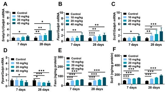 Liver tissues (100 mg) were homogenated and then centrifuged at 5000× g for 10 min at 4 °C, and the levels of Tnf-α, Il-1β and Ccl2 were measured using commercial EILSA kits (Elabscience, Wuhan, China). The content of hepatic Fasn and Scd1 was detected through the use of kits (Shanghai YuBo Biological Technology, Shanghai, China).