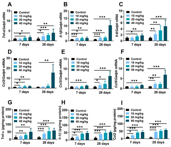 NiNPs exposure induced liver inflammation in mice. (A–C) Hepatic mRNA expressions of the pro-inflammatory cytokines and (D,E) chemokines in mice. (G–I) Hepatic levels of Tnf-α, Il-1β and Ccl2 measured using ELISA. (n = 6, * p < 0.05, ** p < 0.01, *** p < 0.001 compared to control group).