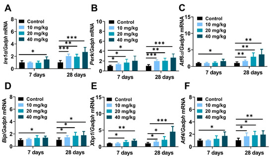 It is well known that excessive nanoparticles exposure can mediate endoplasmic reticulum dysfunction and cell apoptosis in animals and cells [37,38]. This study aimed to explore the underlying mechanisms of NiNPs-induced hepatotoxicity in mice, and the gene expressions regarding endoplasmic reticulum stress (ER stress) were examined. The data showed that the mRNA levels of typical ER stress regulatory elements inositol-requiring transmembrane kinase/endonuclease-1 (Ire1α), PKR-like ER kinase (Perk), activating transcription factor 6 (Atf6), immunoglobulin heavy-chain-binding protein (Bip), X-box-binding protein-1(Xbp1), and activating transcription factor 4 (Atf4) were obviously increased in NiNPs-treated mice compared with the DPBS-injected groups (Figure 6A–C).