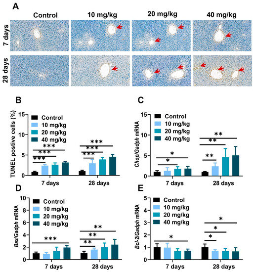 To further investigate the pathological development and mechanism in NiNPs-affected mice liver, a TUNEL assay was used to evaluate hepatocyte apoptosis. As shown in Figure 5, positive liver cells were slightly increased in low-concentration exposure groups and stronger in 20- and 40 mg/kg-treated mice compared to the control mice (Figure 7A,B). Moreover, C/Ebp-homologous protein (Chop), Bcl-2 associated X protein (Bax), and B-cell lymphoma-2 (Bcl-2) gene expressions were measured to demonstrate the basic pathogenic mechanisms of apoptosis (Figure 7C–E). The results exhibited the upregulated mRNA levels of ER stress sensors and apoptosis-correlated factors in NiNPs-administrated mice livers, which were similar to the TUNEL staining results. Taken together, we found that NiNPs exposure stimulated ER stress and then mediated the downstream hepatocyte apoptosis signal pathway in mice.