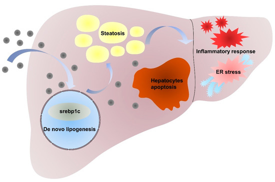 In conclusion, our studies demonstrated that the intraperitoneal administration of NiNPs at doses of 10, 20, and 40 mg/kg/day (body weight) for 7 and 28 days in male C57/BL6 mice has significantly promoted the progression of hepatic lipid accumulation due to de novo lipogenesis (DNL) dysfunction. Furthermore, NiNPs administration triggered hepatic inflammation responses in mice livers. The chronic secretion of inflammatory cytokines and chemokines induced ER stress and hepatocyte apoptosis (Figure 8). These results, to a certain extent, verified the hypothesis that NiNPs injection induced impaired lipogenesis and liver damage manifested by liver steatosis and inflammation response. The findings further our understanding of the molecular mechanisms of NiNPs-caused hepatotoxicity in mice, in addition to supplementing new thoughts for biotoxicology assessment.