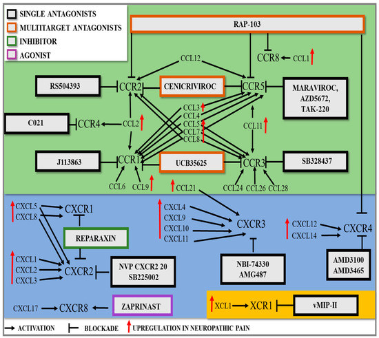 As mentioned in the previous section, chemokines activate specific receptors located on the surface of various immune, glial, and neural cells; twenty receptors have been characterized thus far [8,201]. Each is a seven-transmembrane G-protein-coupled receptor (Gαi) [8]. Published data indicate that the pharmacological blockade of some chemokine receptors from the CC group, as well as from the CXC, XC, and CX3C groups, relieves neuropathic pain of various etiologies in mice and/or rats, which we will discuss in detail in the following sections.