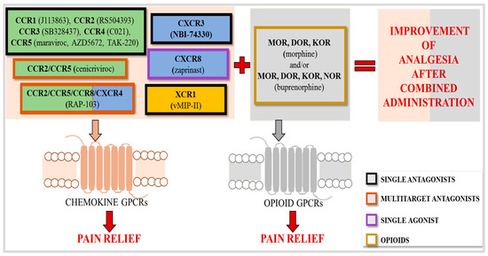 Another interesting pharmacological tool is RAP-103, which blocks four chemokine receptors, CCR2, CCR5, CCR8 [353], and CXCR4, as the latest research shows [354]. It was already shown that RAP-103 prevents and/or diminishes established neuropathic pain hypersensitivity in rats after partial sciatic nerve injury [341] and in a diabetic peripheral neuropathy model [340]. Moreover, RAP-103 evokes analgesia by reducing spinal cord microglial/macrophage activation and monocyte infiltration and by reducing the mRNA expression of IL-1β and IL-6 in the sciatic nerve and spinal cord [341]. Moreover, RAP-103 administered together with morphine enhances its analgesic effect in the DPN model, which is related to the fact that it increases the sensitivity of MOR and reduces the levels of the pronociceptive cytokines TNFα and CCL3, and it also slightly reduced CCL2 [340]. Importantly, in 2022, Bongiovanni et al. reported that RAP-103 diminishes opioid-derived respiratory depression and physical dependence in rats [354]. The authors proposed that this multitarget chemokine receptor antagonist may lessen the risk of opioid abuse [354], which indicates that polytherapy may be useful for the management of both pain and opioid addiction. Therefore, in light of the current literature, it can be said with certainty that by blocking several chemokine receptors that are significantly involved in nociceptive transmission, pain can be relieved; such therapeutic approaches may be extremely helpful in wide range of clinical applications, including opioid pharmacotherapy.